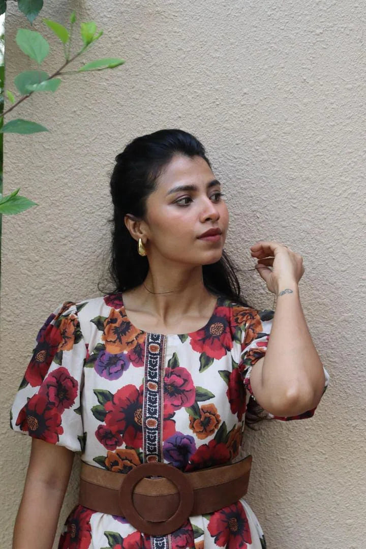 The Mexican Floral dress showcases a delicate beige base adorned with multicolor floral patterns. Crafted from cotton with a soft lining, it offers comfort and elegance suitable for every occasion. Made in India, this dress blends timeless design with everyday wearability.