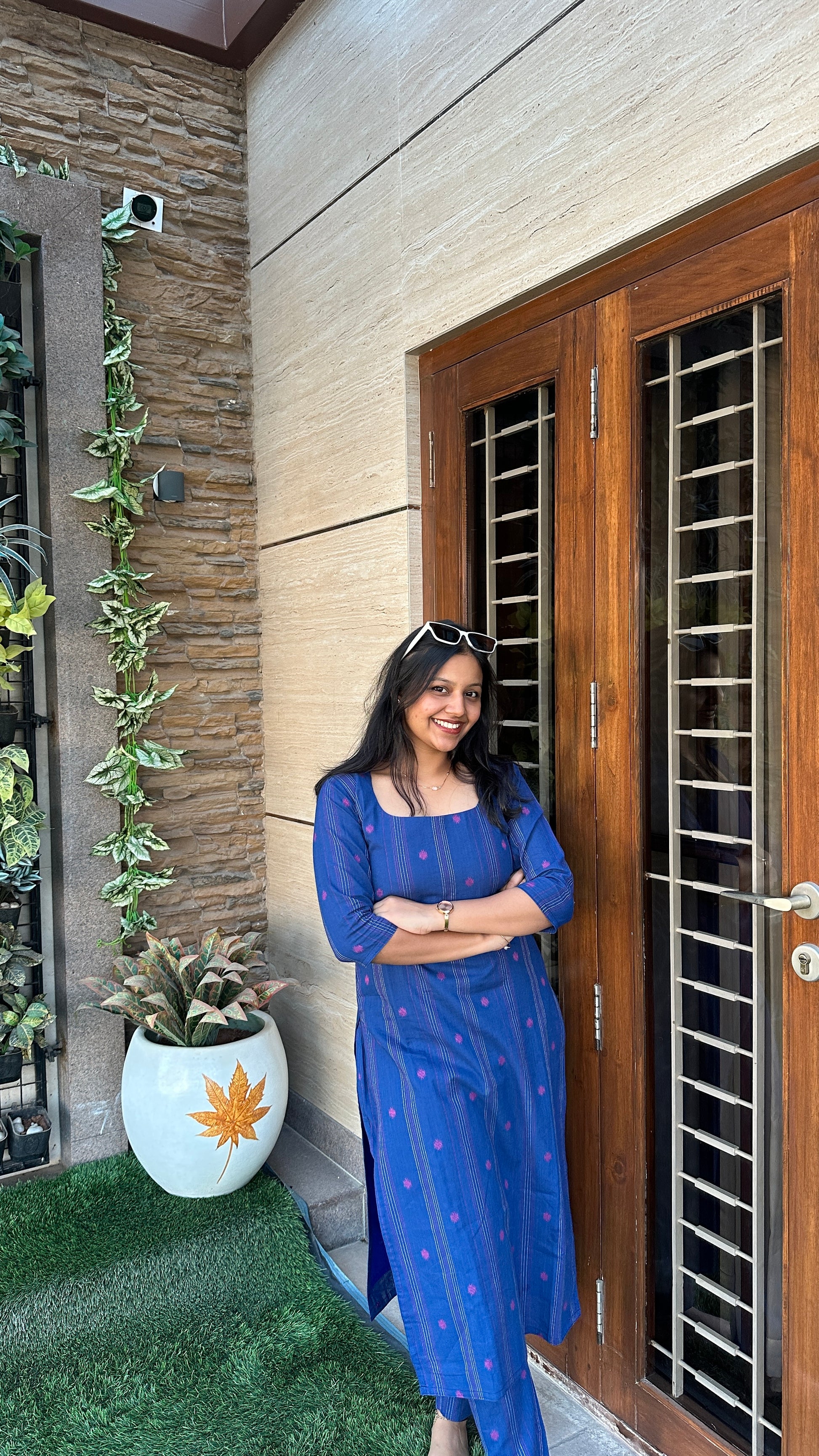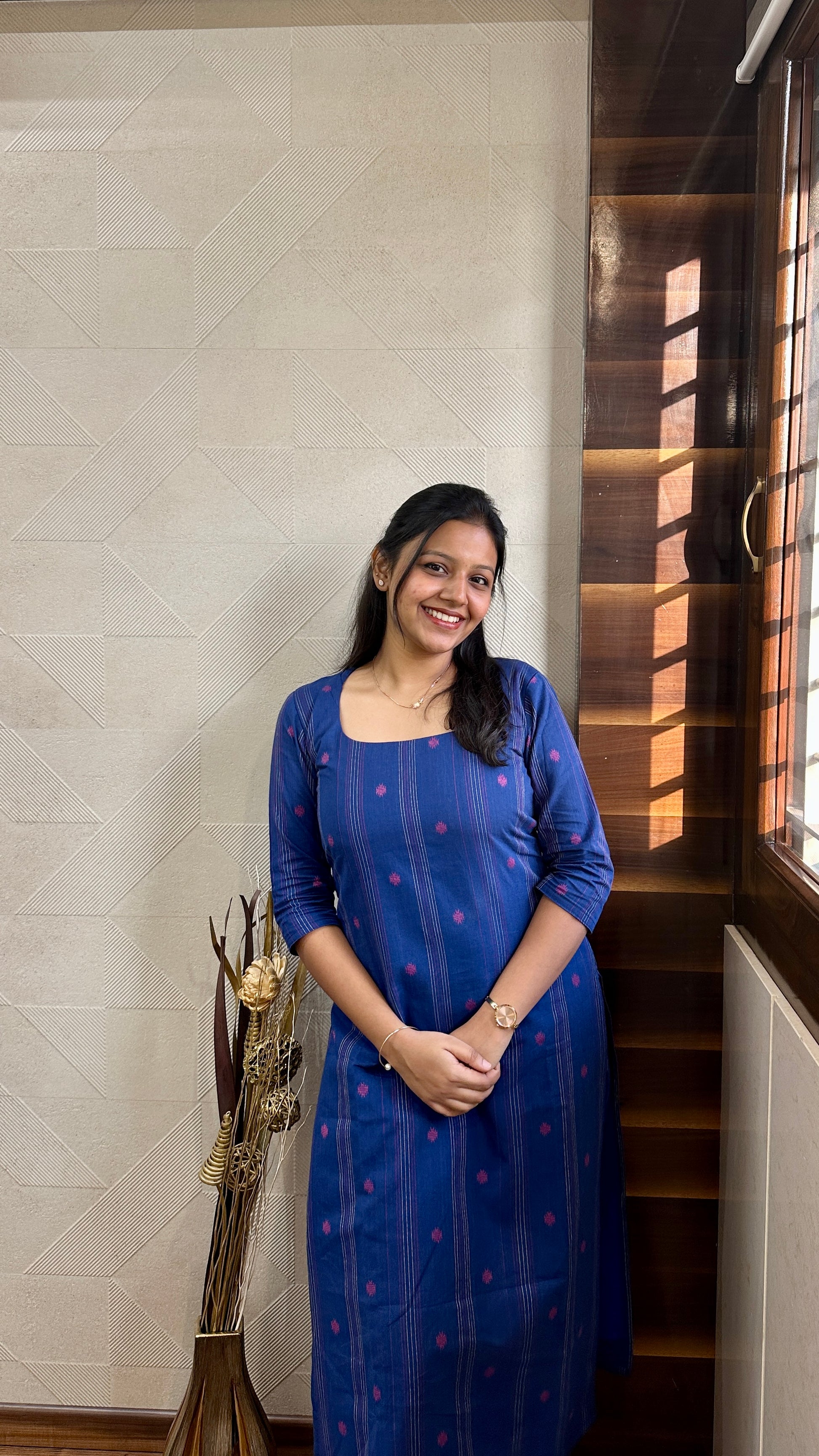 Crafted in rich indigo hues, this elegant handloom kurti set is a timeless blend of comfort and understated charm. The kurti features delicate vertical stripe detailing accented with subtle woven butti motifs, creating a graceful silhouette that flatters every body type. Designed with a classic square neckline and comfortable elbow-length sleeves, it’s perfect for everyday sophistication as well as relaxed festive wear.