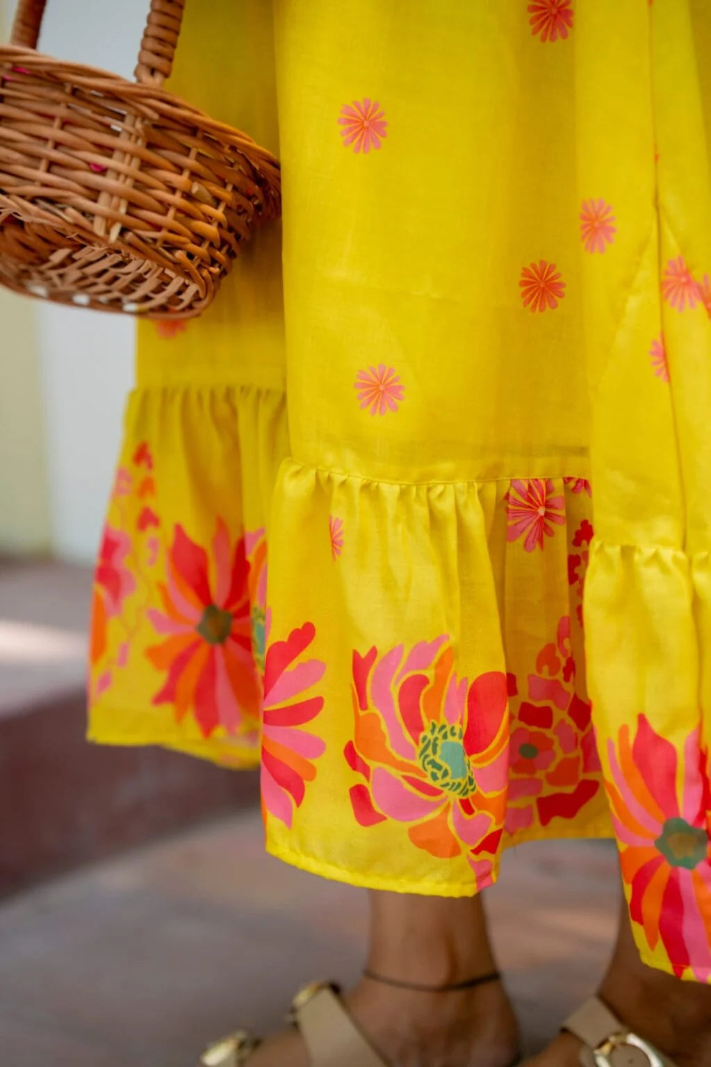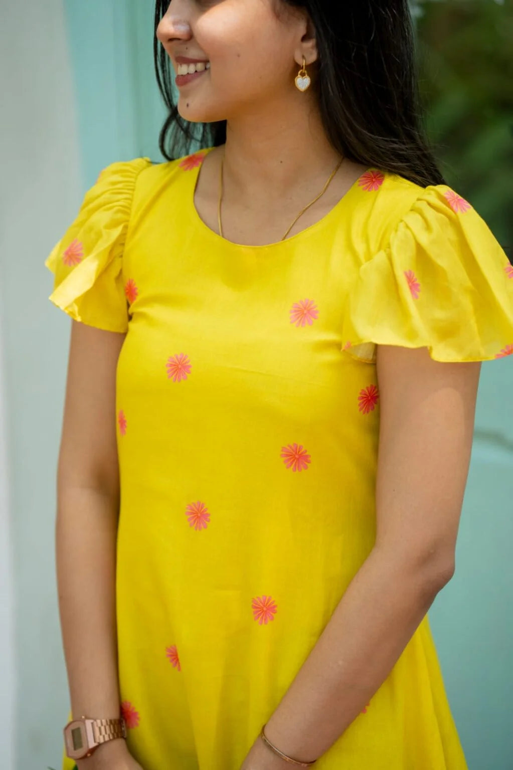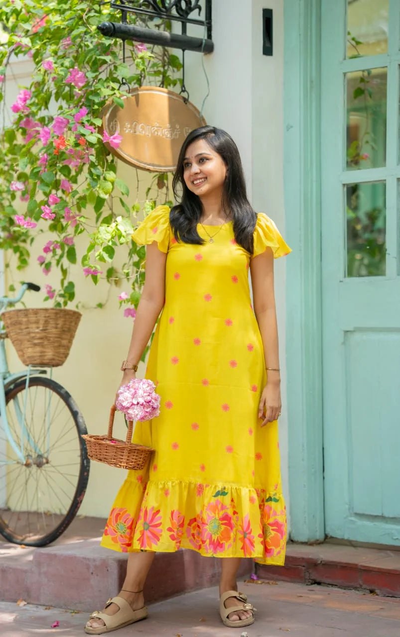 Crafted from lightweight, breathable pure cotton, this yellow floral dress features a delicate floral pattern, short puff sleeves, and a round neckline. Designed for comfort and style, it's ideal for both casual and semi-formal occasions. Made in India, it offers a perfect blend of elegance and practicality.