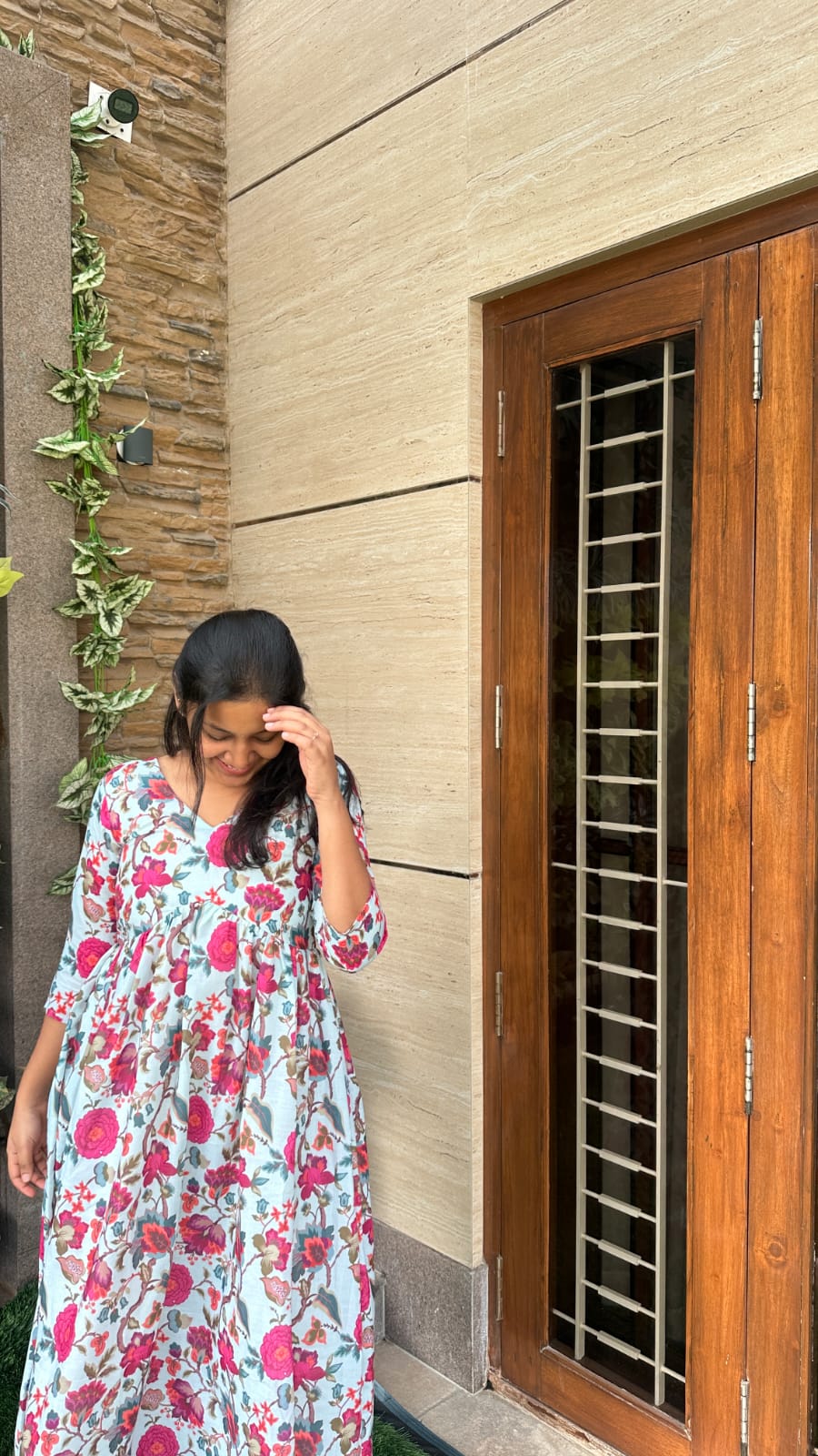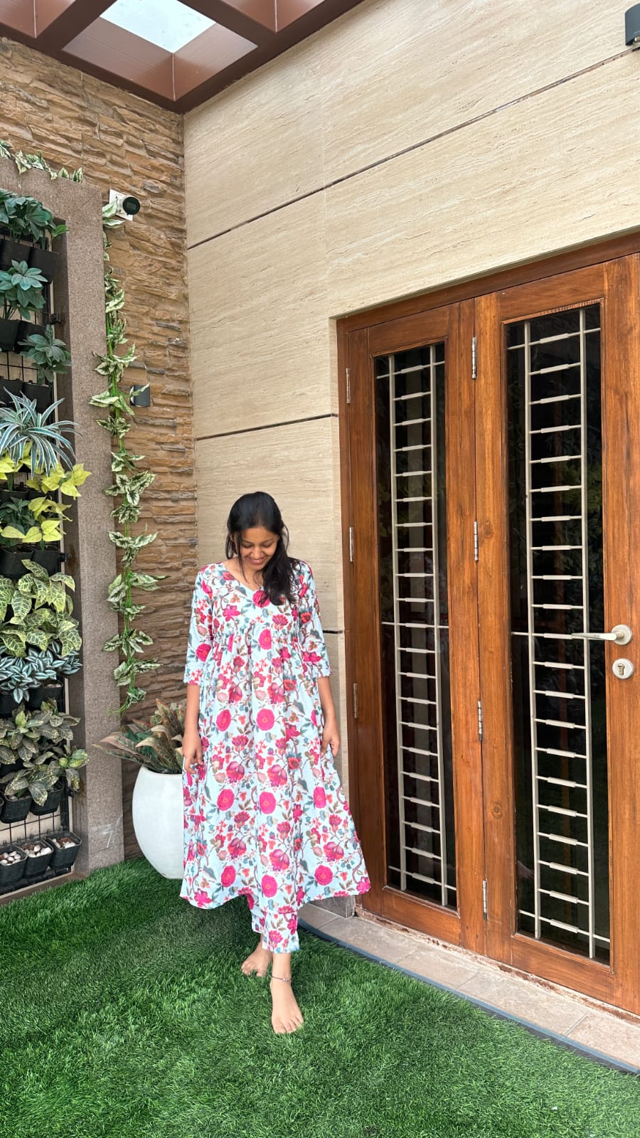 Graceful floral co-ord set designed for effortless elegance. The set features a beautifully tailored V-neck top with 3/4th sleeves, paired with a flowy, high-waist bottom crafted from the same soft printed fabric. The delicate floral motifs on a soothing pastel base add a timeless, feminine charm, while the structured yoke and gathered silhouette create a flattering fit.