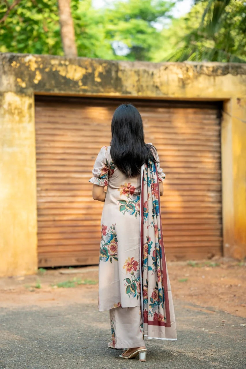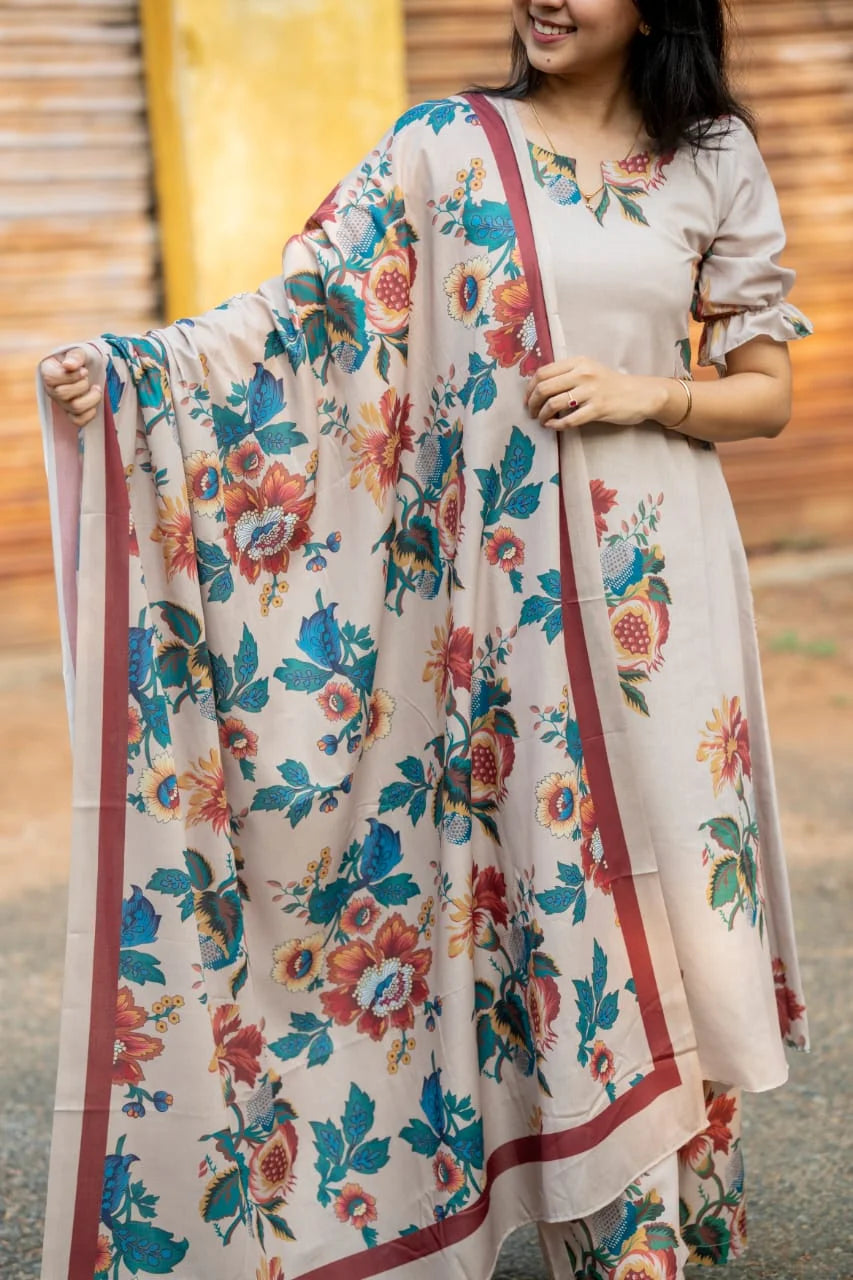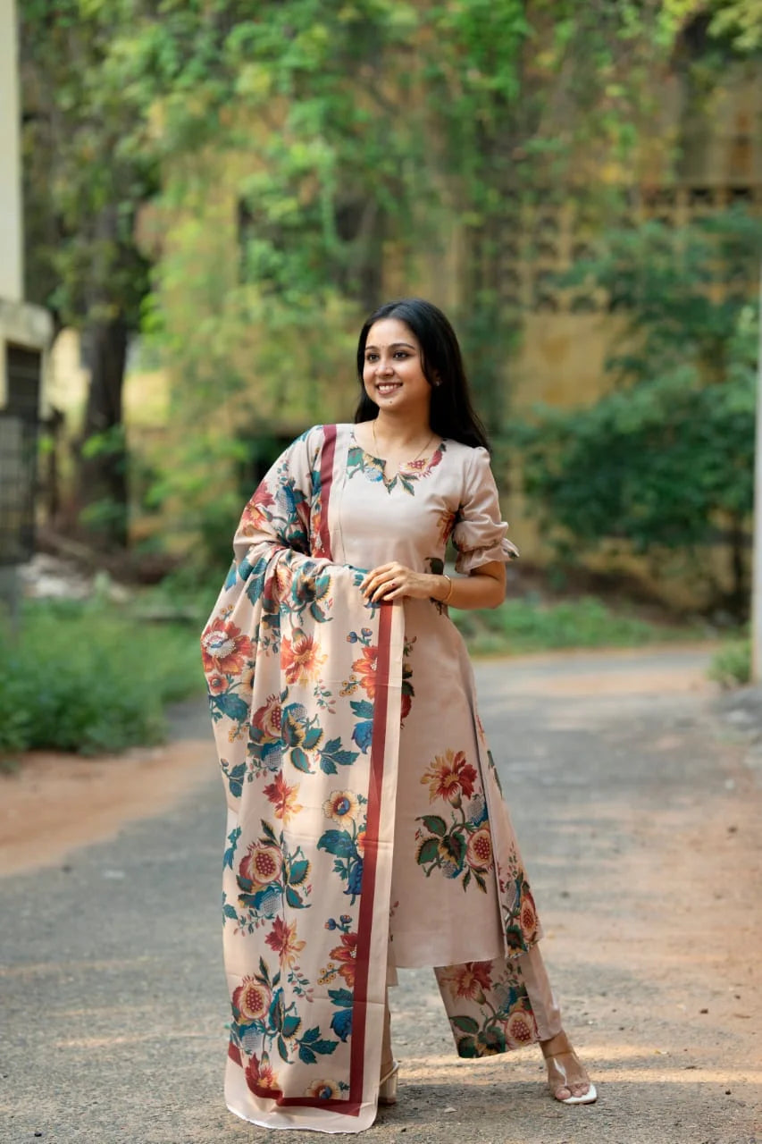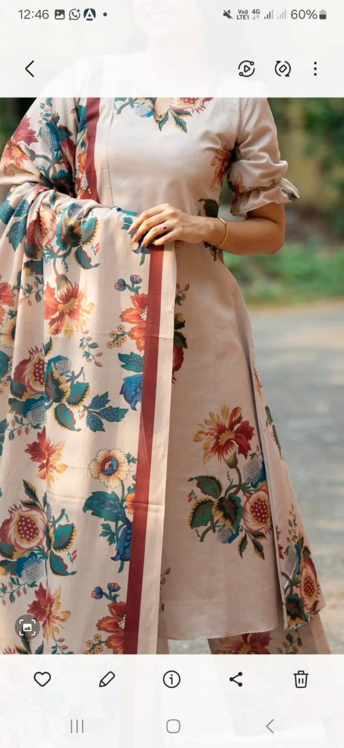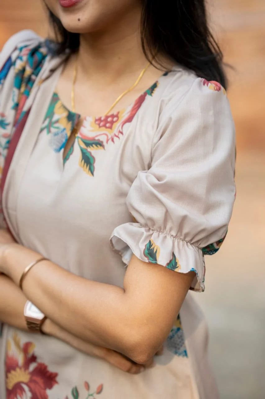 The Vintage Bloom salwar set features a lined cotton kurta paired with stylish bell bottom cotton pants, combining comfort and contemporary design. Crafted in India, this versatile ensemble is perfect for every occasion, offering a graceful silhouette with everyday ease.